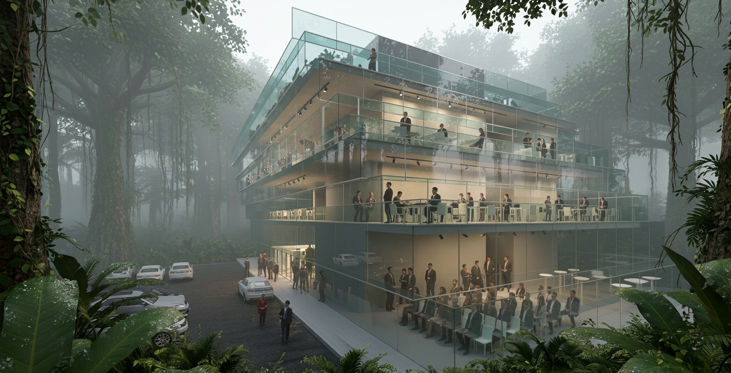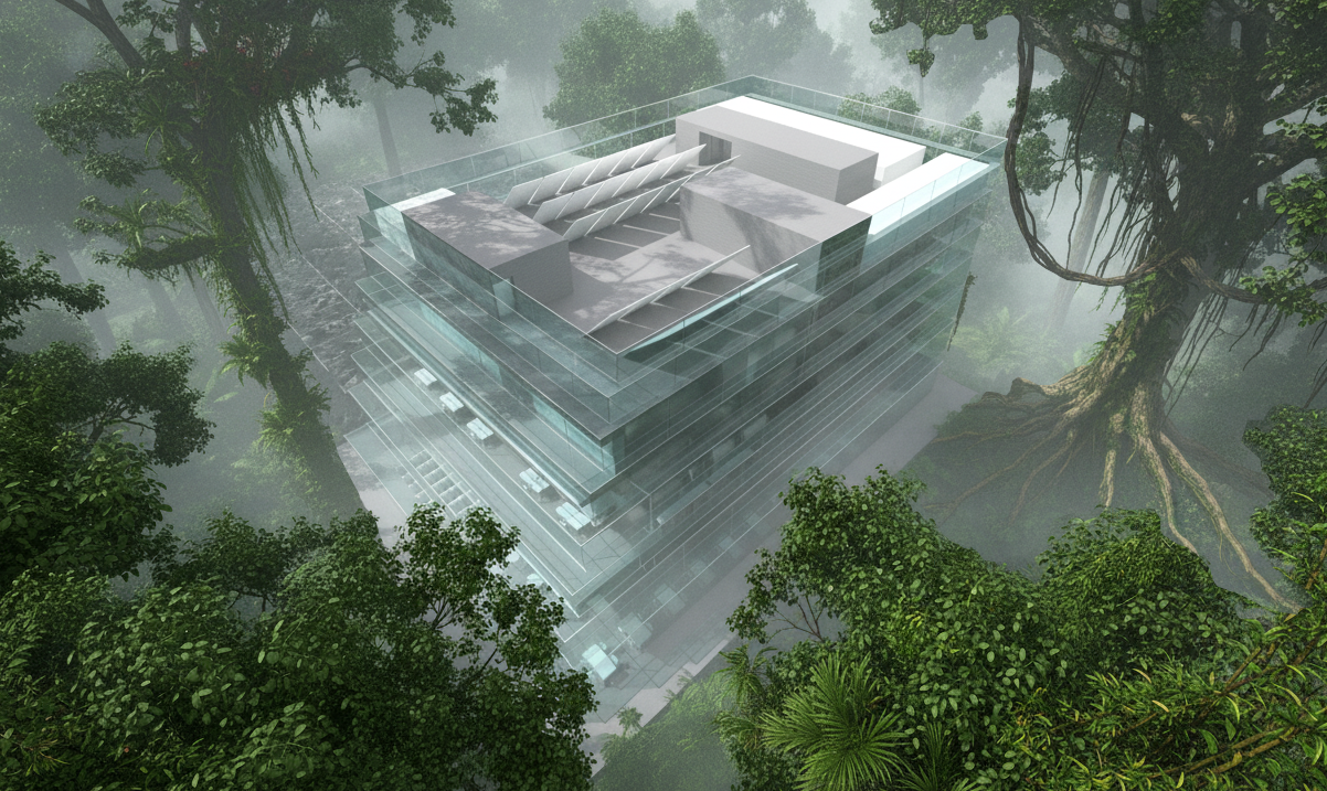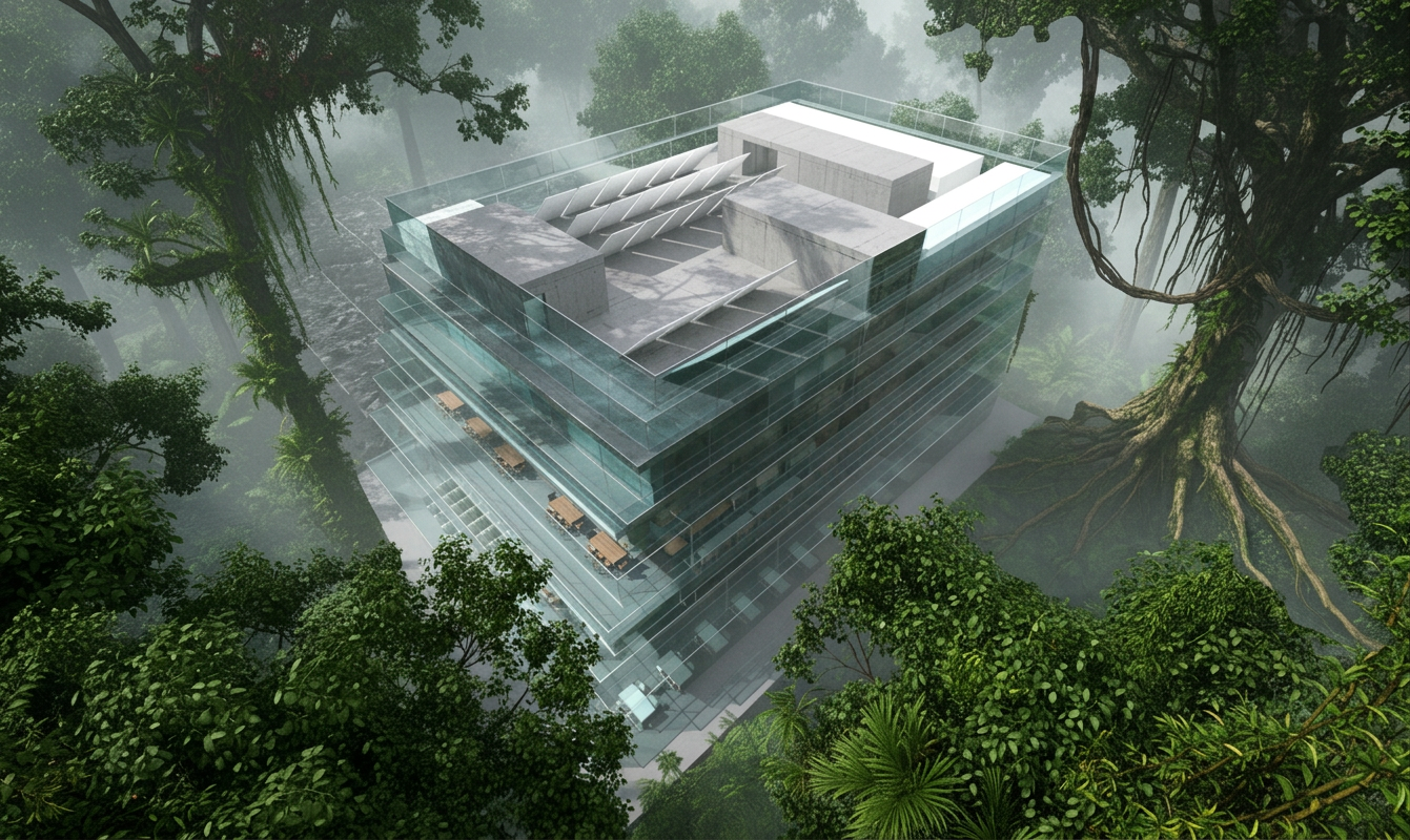 This project is conceived with a strong emphasis on sustainable architecture and creating a minimal ecological footprint. The design functions as a quiet observatory of the surrounding ecosystem, fostering a deep connection to nature. The extensive use of high-performance glazing is a key feature of its passive solar design, maximizing natural light to reduce energy consumption. The concrete structure provides thermal mass, helping to regulate internal temperatures in the tropical climate. The building's design as a "rational object" in the wild suggests a contained system, implying strategies for on-site water management, such as rainwater harvesting, and efficient waste reduction would be critical. This approach to eco-friendly design ensures the headquarters for scientific advancement also serves as a model of environmental stewardship.