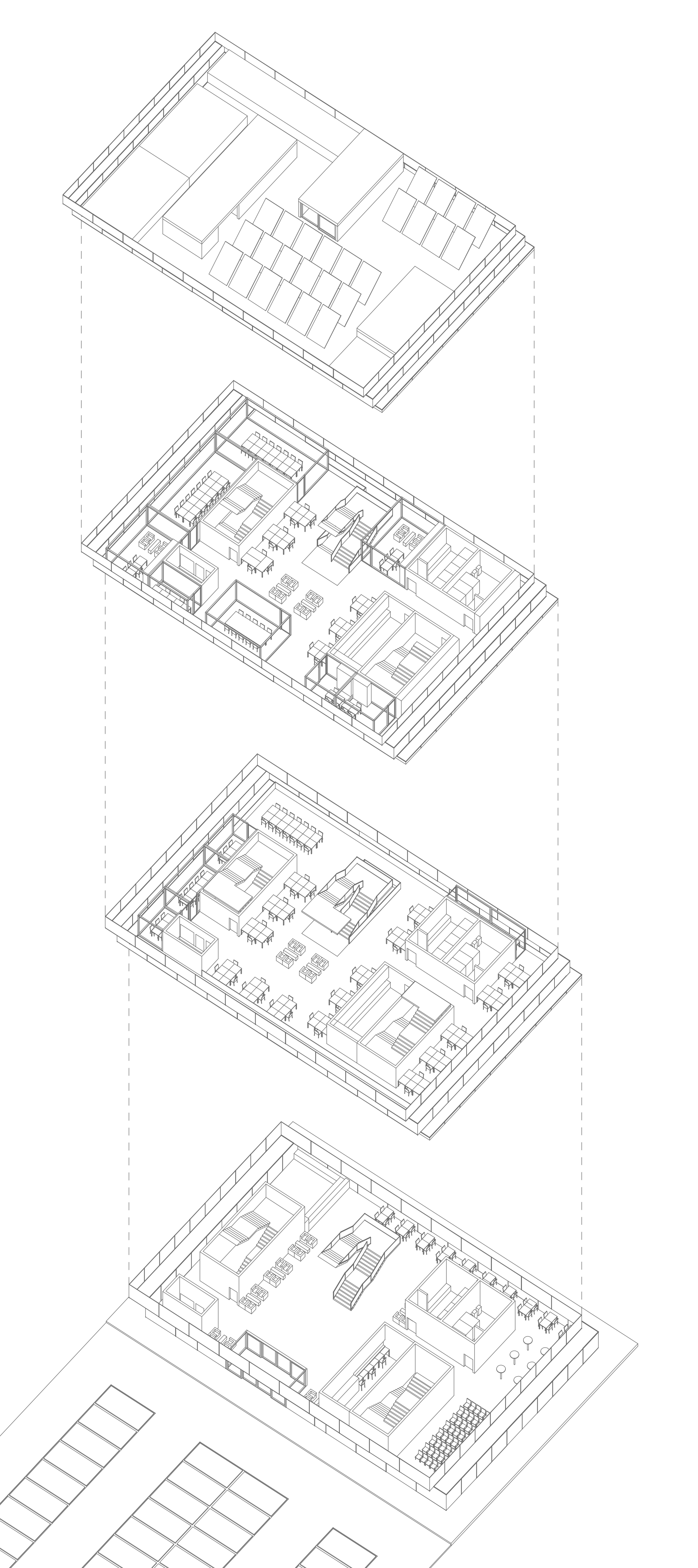The architectural expression is defined by a stark material duality. A fully-glazed facade creates a transparent envelope, dissolving the boundary between interior and exterior. In direct opposition, the interior structure is rendered in exposed concrete. This monolithic core is given a dynamic spatial quality through its vertical organization; the building levels are stacked asymmetrically, with each floor plate offset in both length and width. This deliberate staggering carves out dramatic, multi-level voids that vertically connect the interior, breaking down the traditional separation of floors.