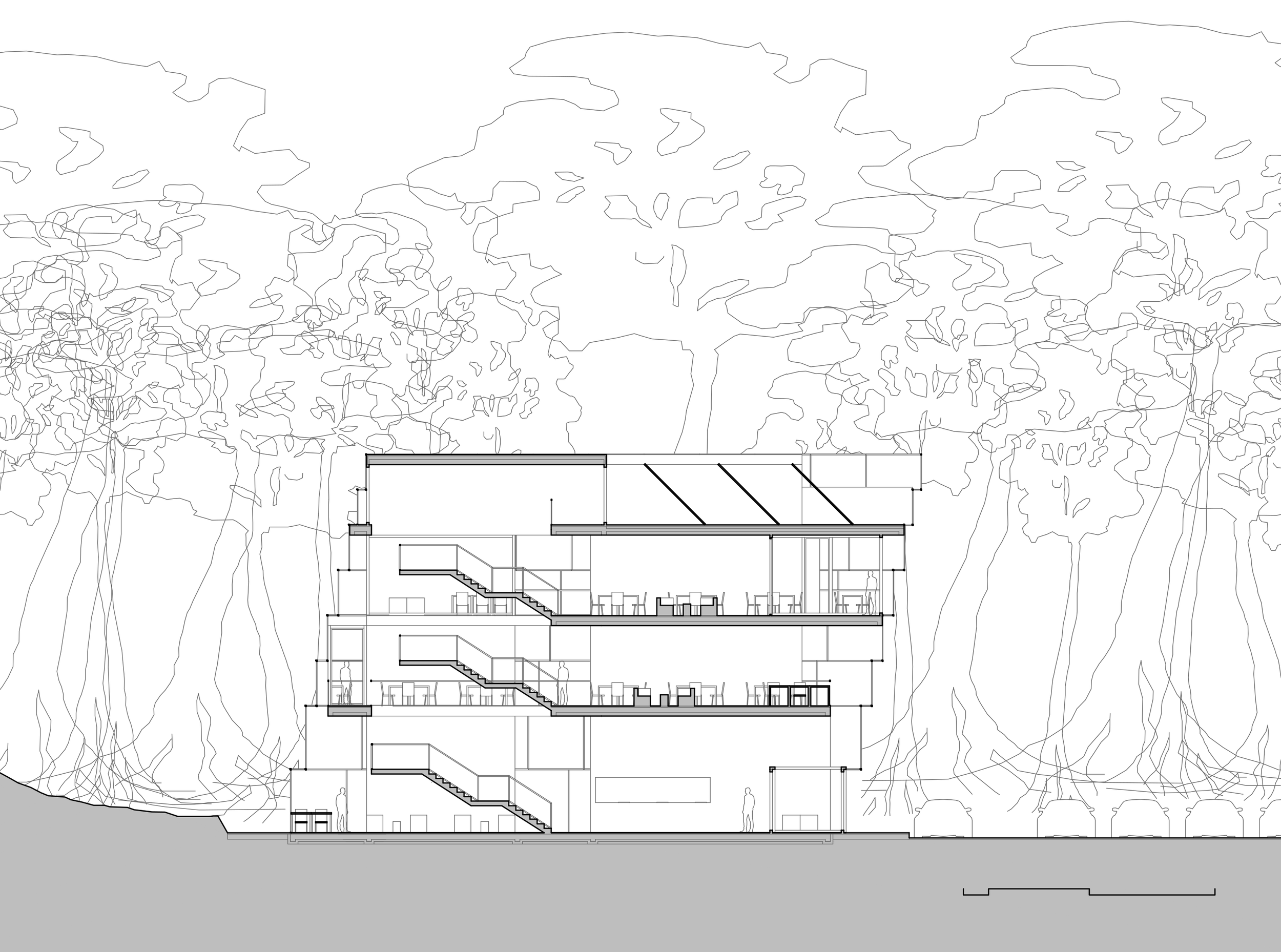 While situated in a natural, non-urban context, the headquarters establishes a powerful relationship with its site, acting as a distinct landmark within the natural landscape. Its relationship with the "urban" fabric is, in this case, a dialogue with the complex ecosystem of the rainforest. The building does not seek to blend in but rather to assert its presence as a place of human innovation. Its transparent nature, however, ensures that it remains visually connected to its surroundings, framing and celebrating the environment rather than dominating it. In this remote setting, the project contributes to its context by creating a contained hub of human activity that respects and observes the primordial world around it, functioning as a self-contained "urban" node in the heart of nature.