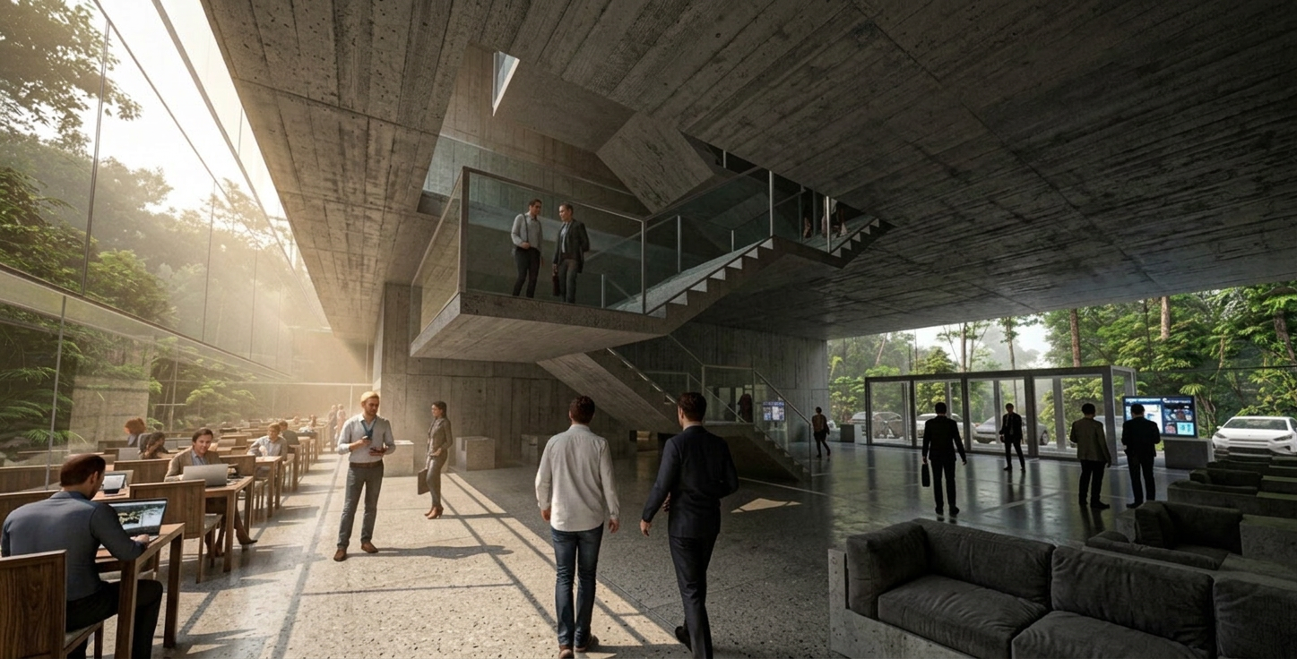 The project's material palette is defined by a stark and intentional contrast between high-performance glazing and exposed concrete. The fully-glazed facade acts as a transparent skin, creating a seamless connection with the surrounding ecosystem while providing a controlled internal environment. This choice in sustainable building materials maximizes natural daylight, reducing the need for artificial lighting. In direct opposition, the interior is characterized by the raw, monolithic presence of exposed concrete. This choice provides a sense of permanence and solidity, grounding the lightweight transparency of the glass envelope. The rationale behind this material duality is to create a dialogue between the man-made and the natural, the precise and the organic. The durability and thermal mass of concrete, paired with the advanced thermal properties of the glazing, contribute to the building's overall energy efficiency.