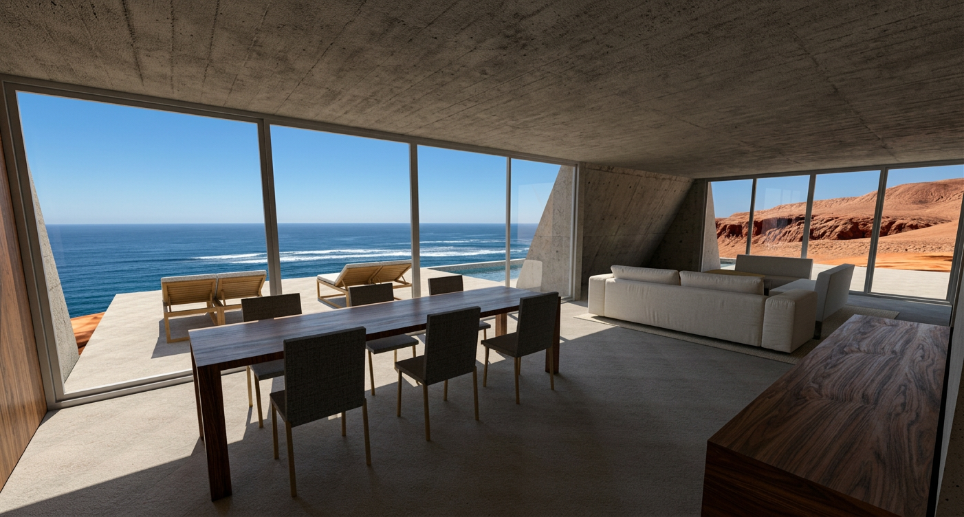 This concrete residence, set on the dramatic coastline of Chile's Atacama Desert, is a direct architectural response to its extreme environment. The design merges a minimalist aesthetic with a powerful, site-specific strategy, creating a sustainable luxury retreat that is both visually striking and functionally sound.