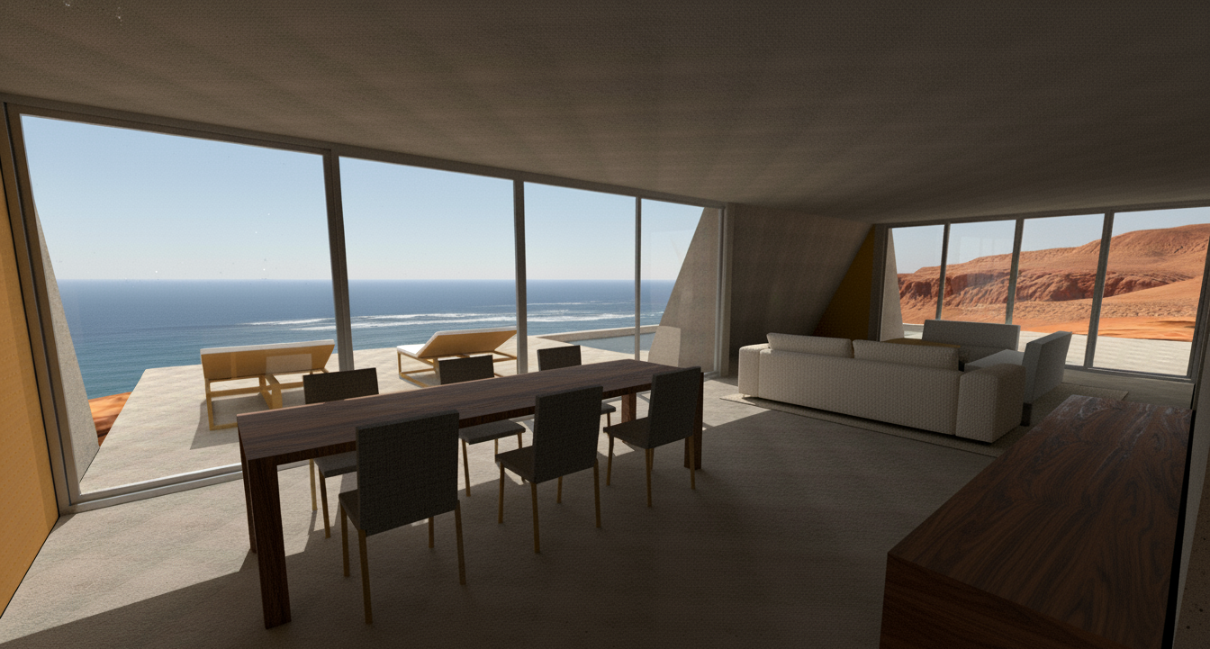 Material Aspects: The primary material is exposed concrete, chosen for its durability in the harsh coastal environment and its significant thermal mass. This material choice is central to the project's sustainability and aesthetic, allowing the building to absorb the day's heat and radiate it back during the cool desert nights. Large expanses of high-performance glazing are used to maximize views while minimizing solar heat gain, crucial in this extreme climate. Keywords related to materials include sustainable building materials, exposed concrete, thermal mass construction, and high-performance glazing.