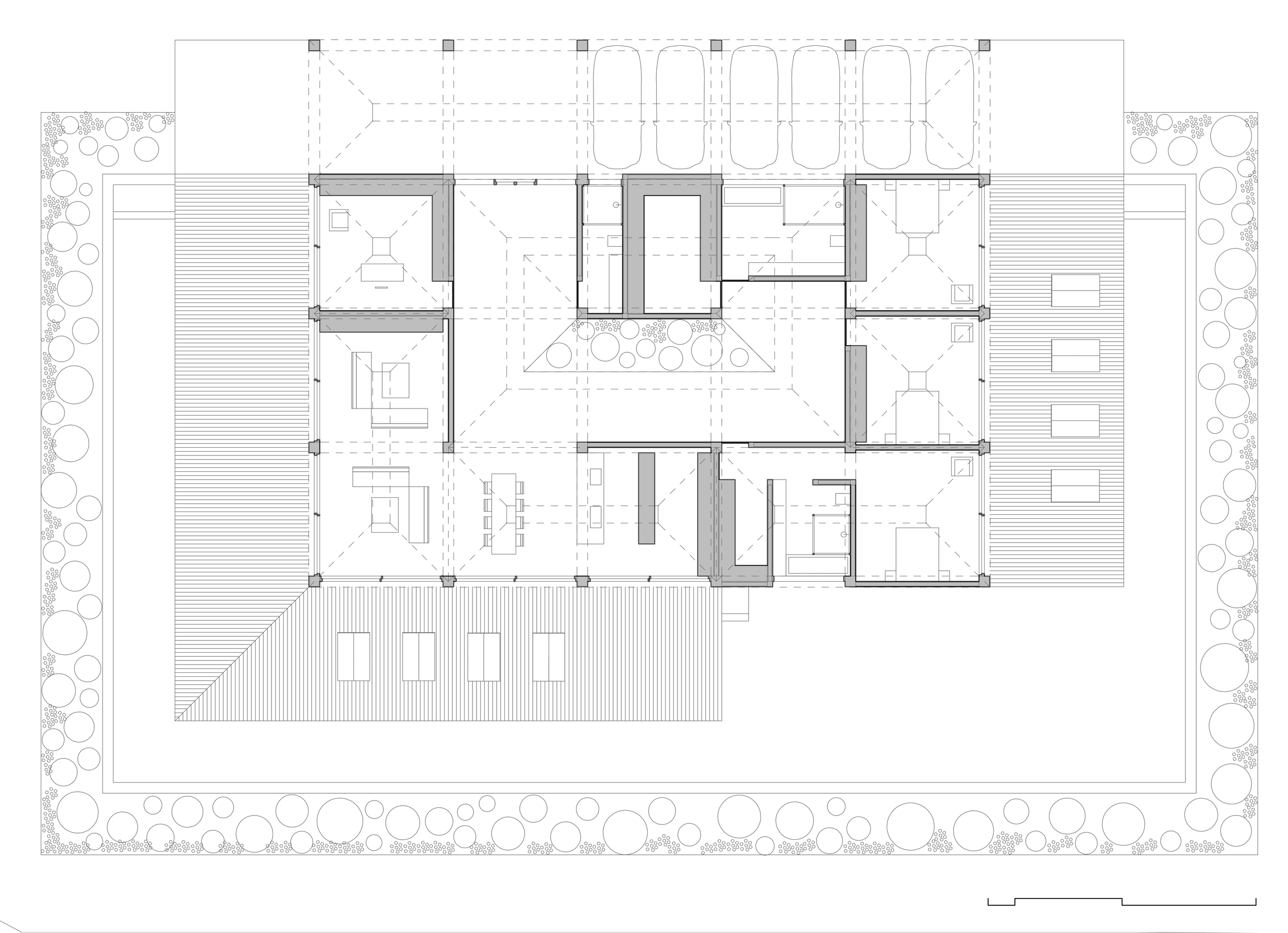 A significant feature of the property is its naturally filtered infinity pool. This chemical-free system utilizes a regeneration zone with aquatic plants to purify the water, mimicking a natural lake's ecosystem. The pool's edge is designed to create the visual effect of merging with the ocean horizon. The wooden decks are separated, one for the public areas and one for the private bedrooms; each has its own access to the shared continuous pool.