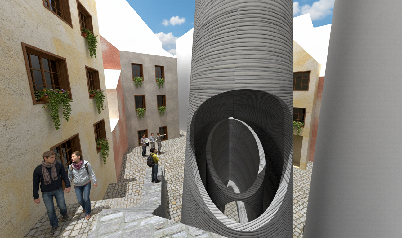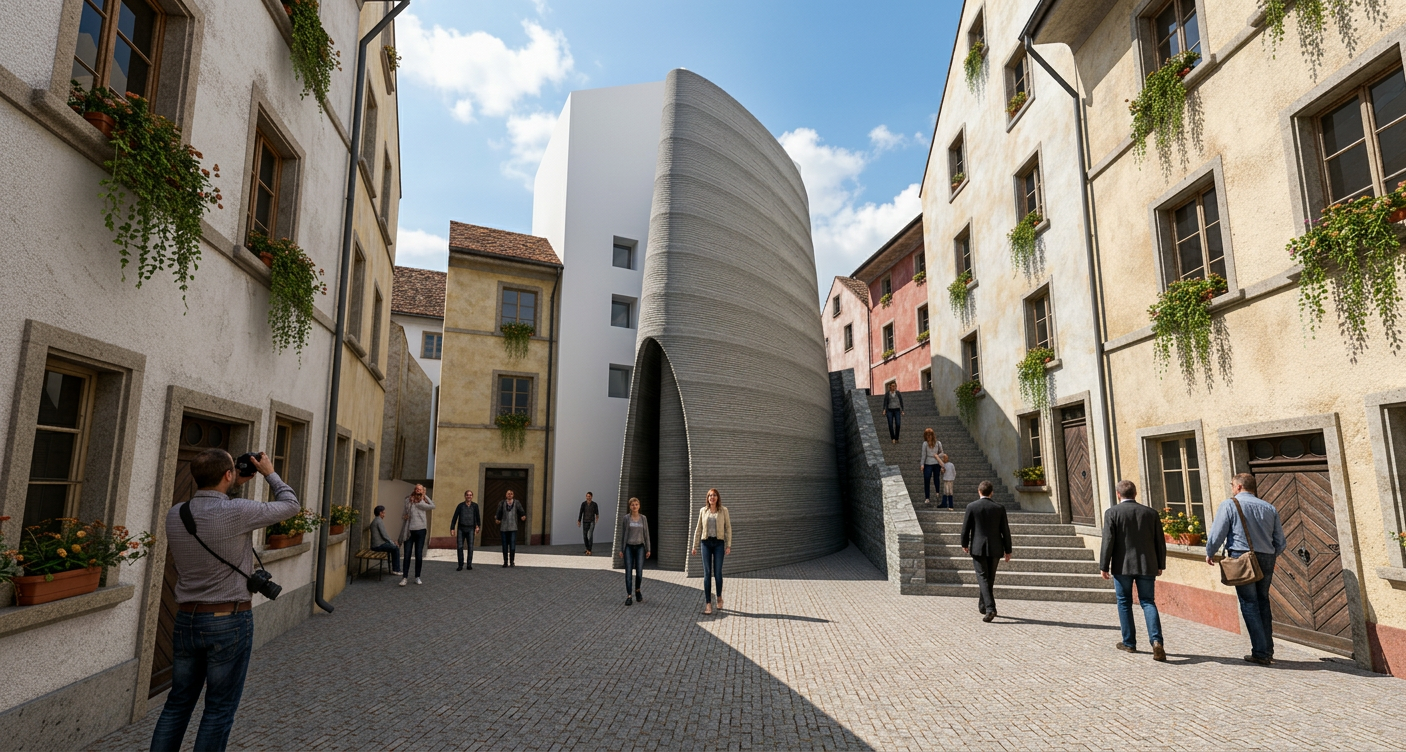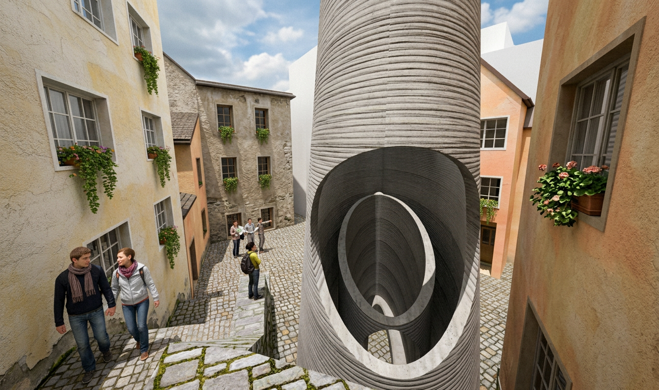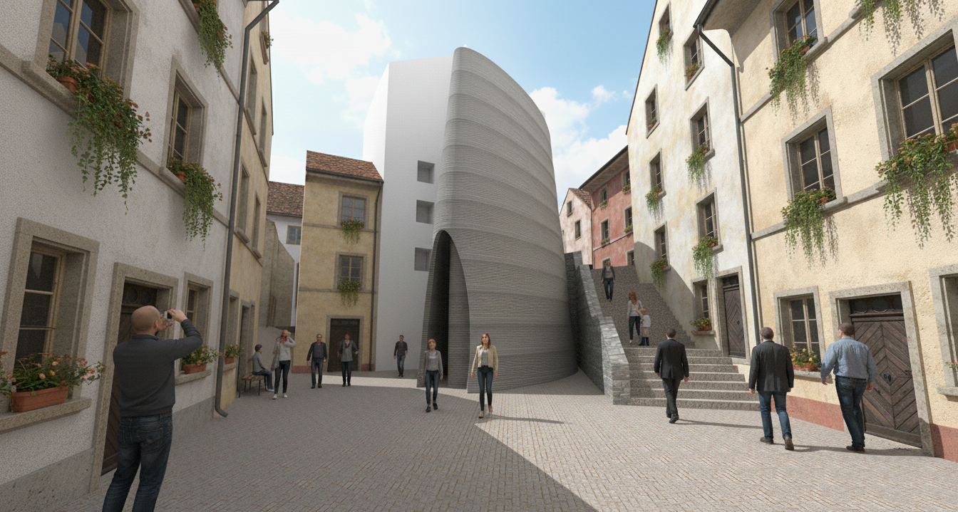 Nestled within a medieval courtyard in Basel, this project introduces a contemporary contemplative chapel. The intervention is conceived as a monolithic tower, creating a space of serene refuge that establishes a direct dialogue between advanced digital fabrication and its historic, handcrafted context.