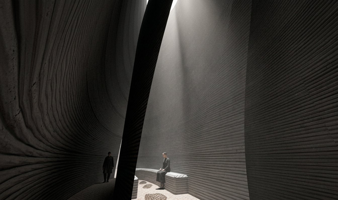 The chapel’s form is a product of its construction: 3D-printed concrete is deposited layer by layer, creating a distinct, striated texture. This continuous surface is a direct expression of its digital origins and serves as a canvas for the interplay of light and shadow. The tower’s geometry is precisely sculpted to shield the interior from the city while opening it to the sky.