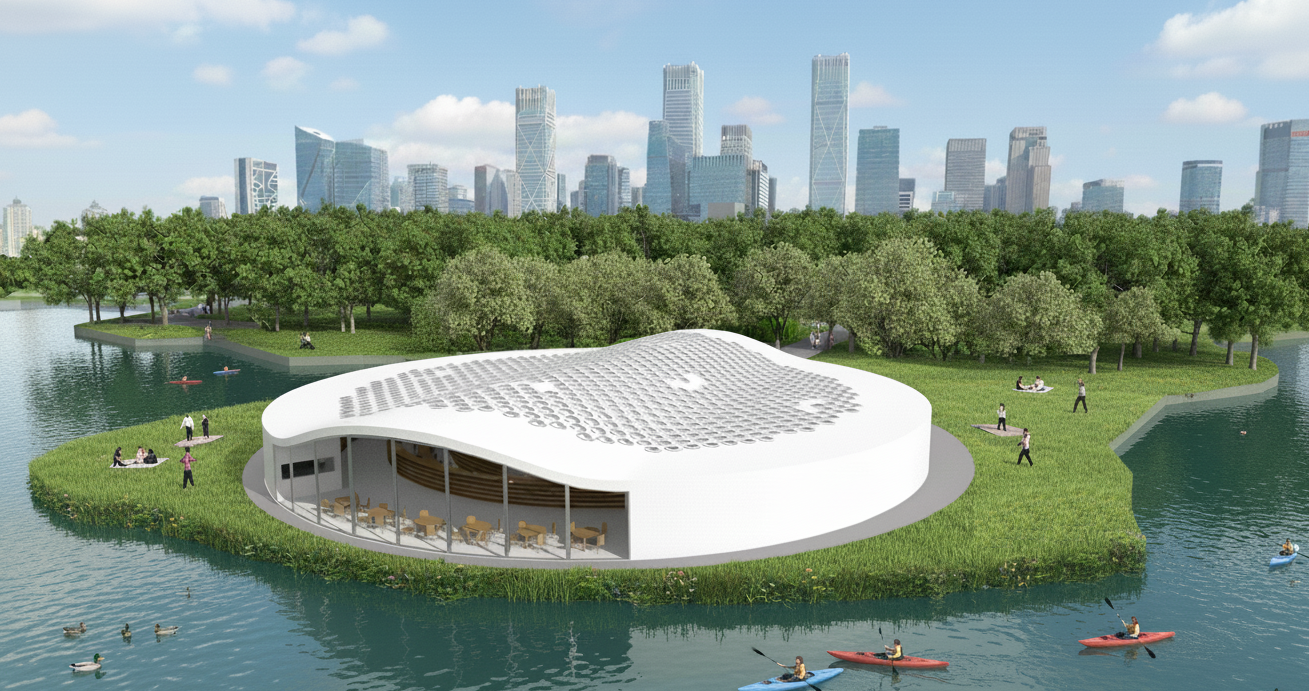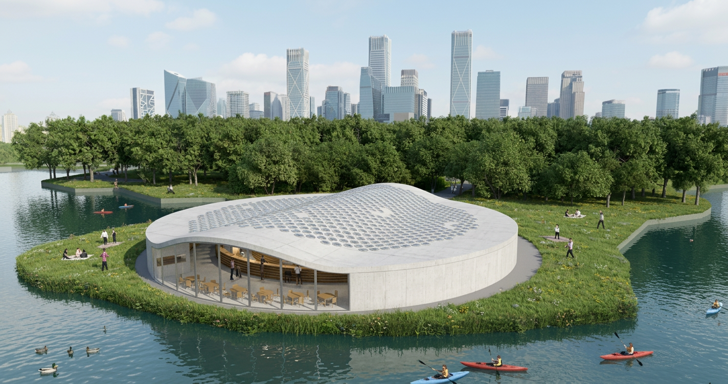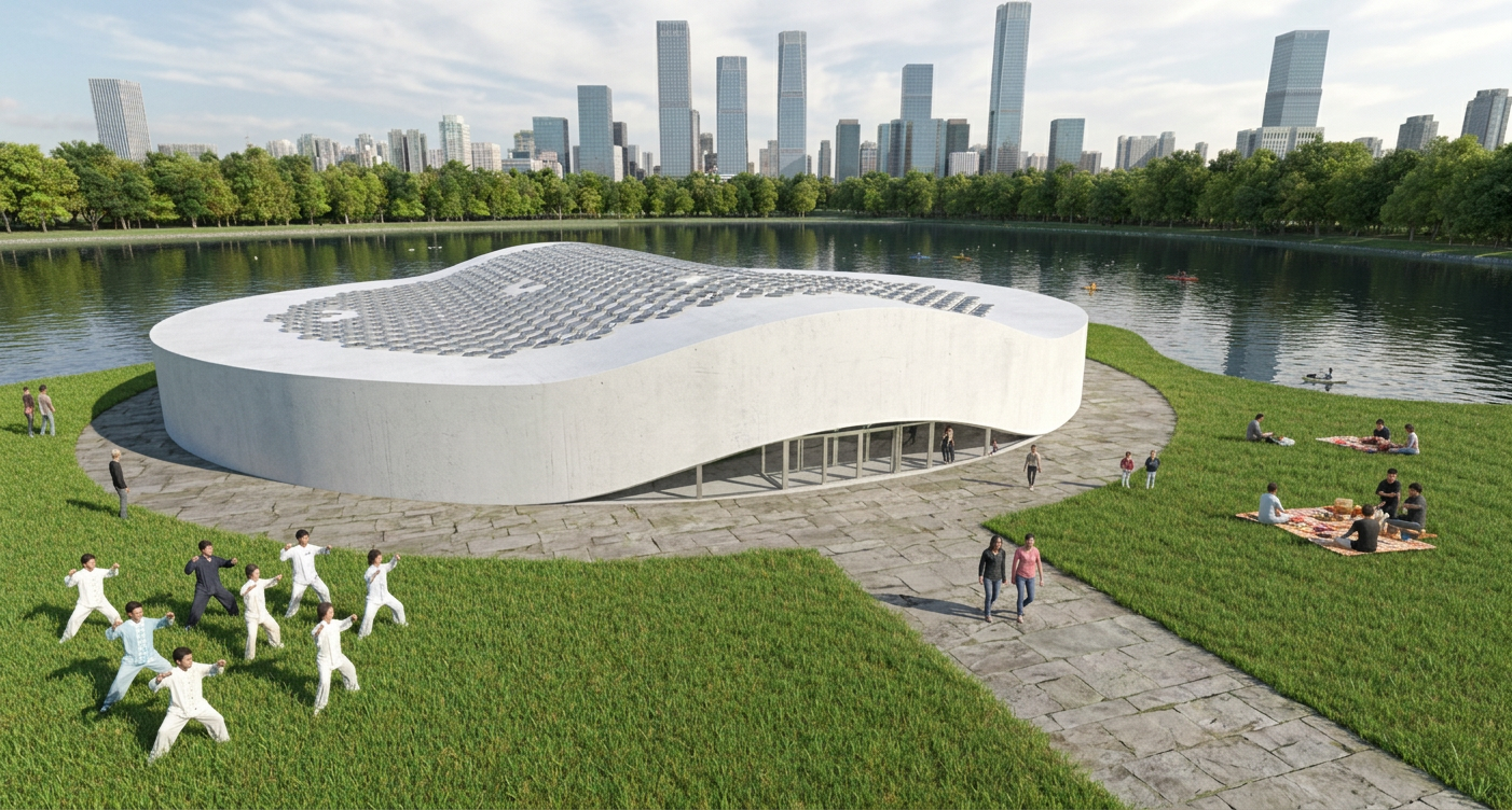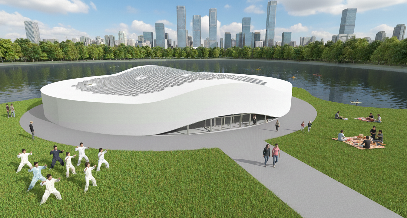 Located in a public park in Beijing, the Cloud Pavilion is a library conceived as a monolithic pavilion that mediates between the natural landscape and the urban skyline. The building’s pure, circular form, rendered in white concrete, establishes a quiet presence in the park. The primary architectural gesture is a gently arching roof that drapes over the plan; its subtle undulations create a welcoming entrance arch on one side and a sweeping panoramic window overlooking the adjacent lake on the other, dissolving the boundary between interior and exterior.