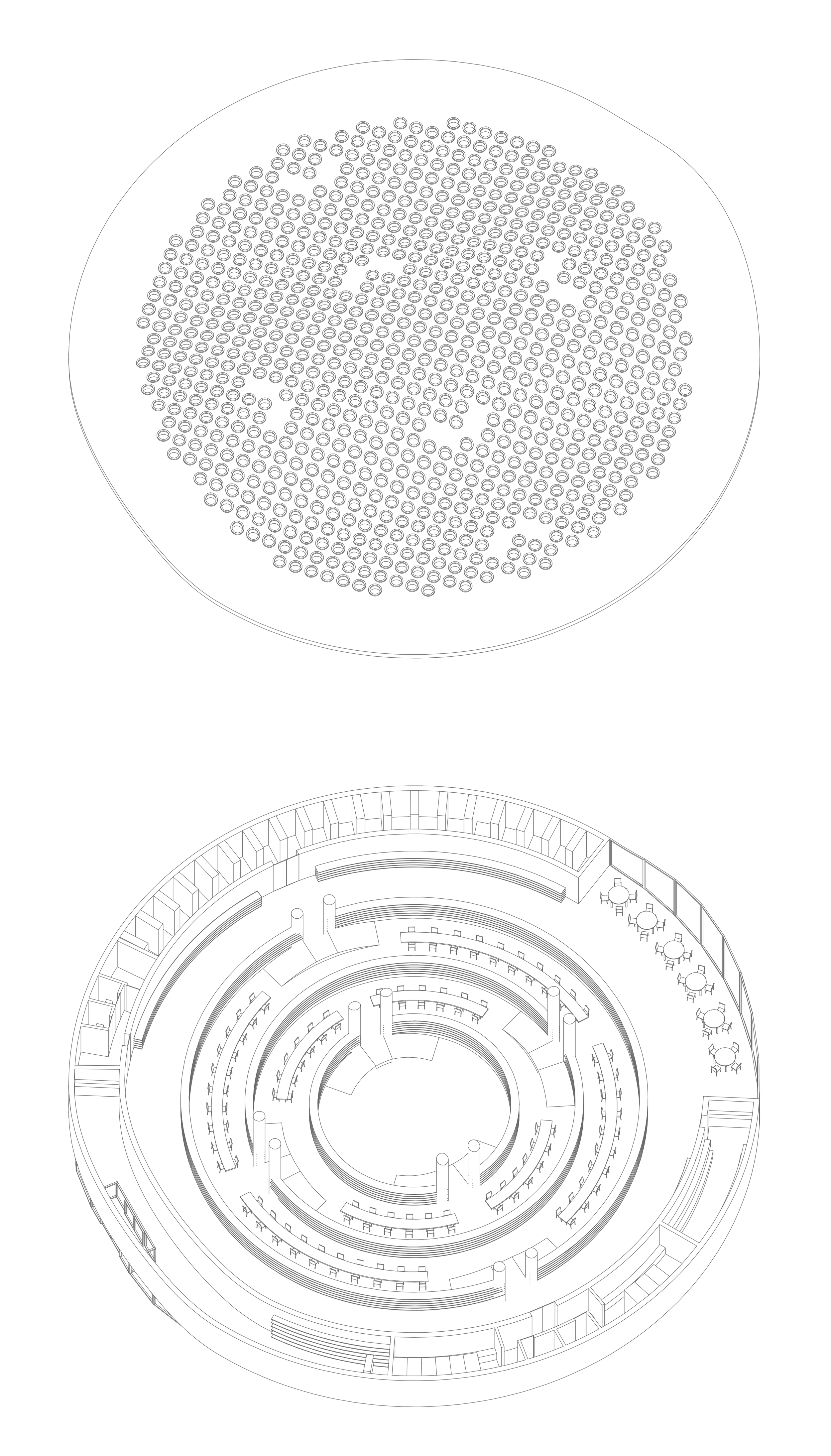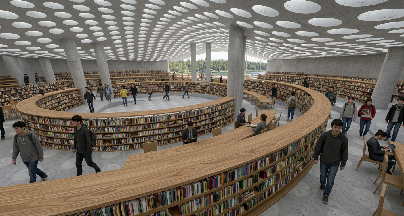 Inside, the library concentric rings of timber bookshelves create an interior topography reminiscent of an amphitheater, guiding visitors inward toward a central, open space designed for performances and community gatherings. The quality of the interior is defined by natural light. The concrete roof is perforated by a dense pattern of circular skylights, which filter daylight to create a gentle, diffuse illumination ideal for reading. The simple palette of white concrete, warm timber, and abundant natural light fosters a serene and focused environment for both individual study and collective cultural events.