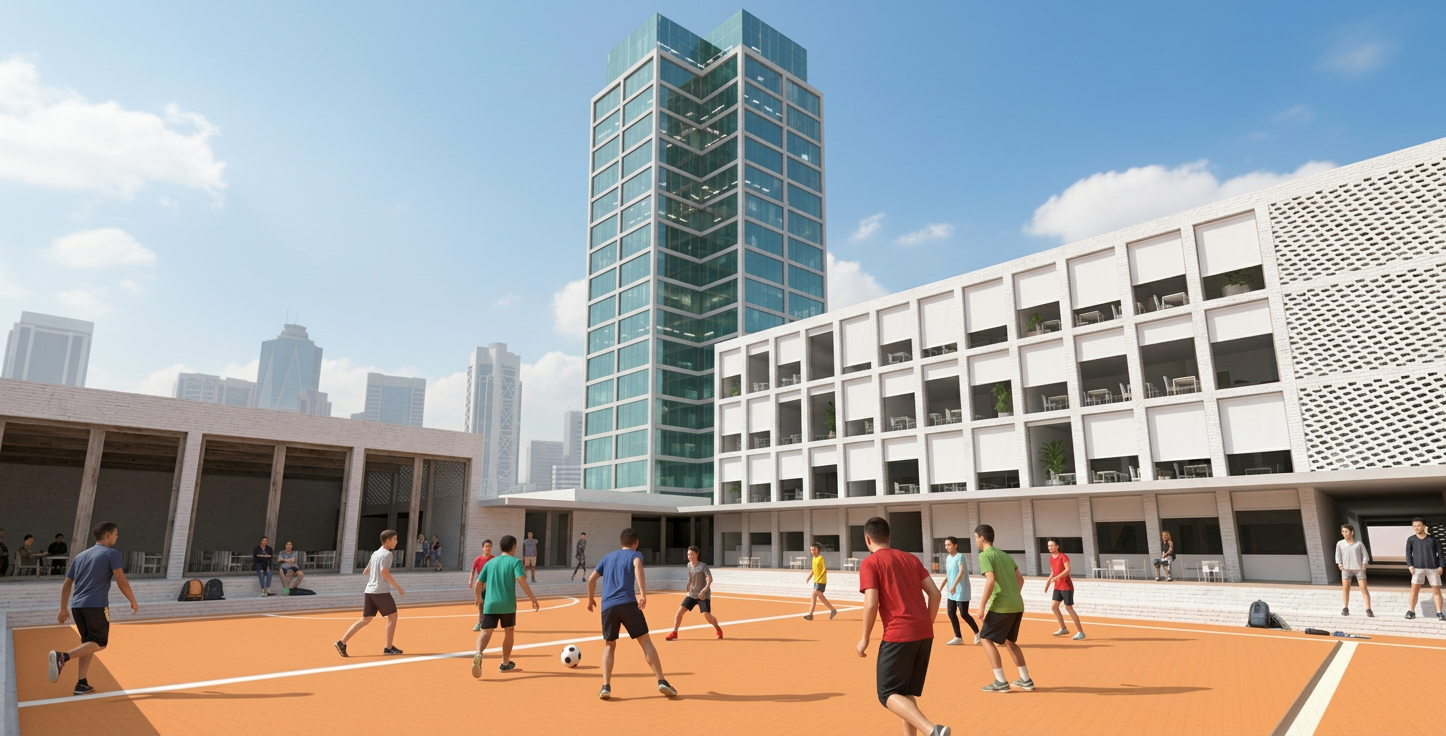 Located in the dense urban fabric of Bengaluru, the school is designed as an inward-looking oasis that responds to its context. The campus layout, with its interconnected courtyards, creates a series of sheltered open spaces, a valuable amenity in a crowded city. By creating a microclimate, the design mitigates some of the negative effects of the urban heat island effect. The school's distinct architectural form contributes positively to the local urban landscape. The project demonstrates how educational institutions can be successfully integrated into dense urban environments while providing high-quality learning spaces.