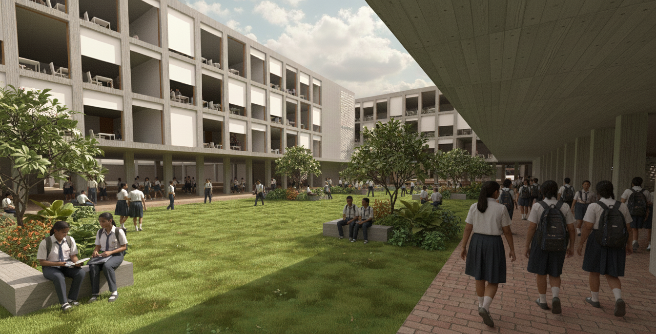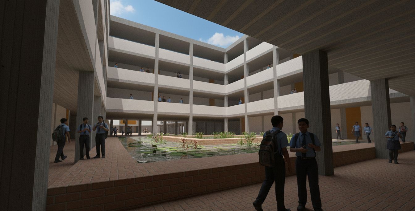 Sustainability is at the core of this project's design philosophy. The reliance on passive design strategies significantly reduces the school's energy consumption and ecological footprint. The use of natural light and ventilation minimizes the need for artificial lighting and air conditioning. The integration of green spaces and water features not only contributes to the passive cooling strategy but also enhances biodiversity on the campus. The project also incorporates rainwater harvesting to manage water resources sustainably, a critical consideration in a city like Bengaluru that faces water scarcity.