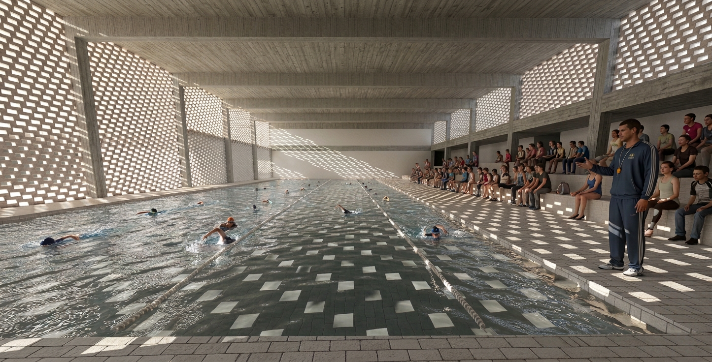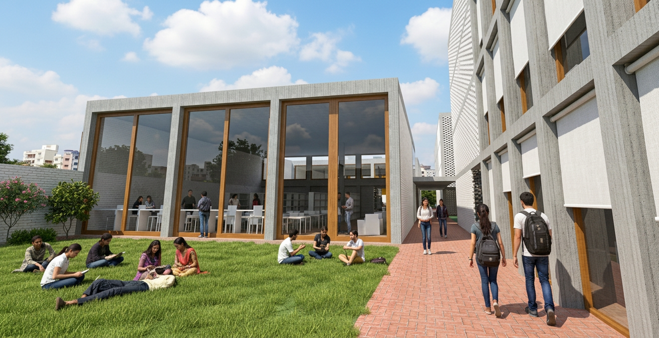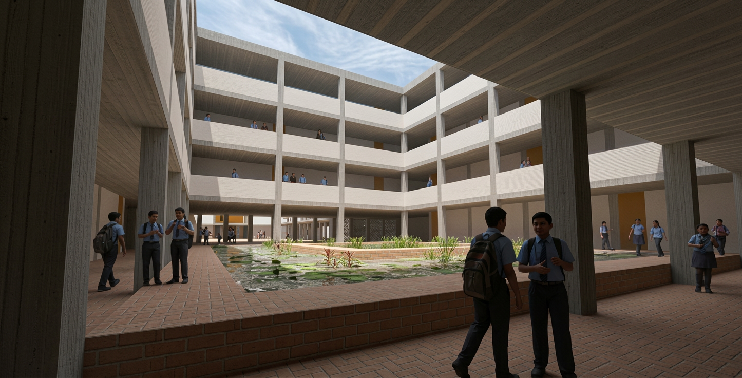 The structure combines an exposed concrete frame with white brick walls. The facade design is central to the project's sustainability strategy, employing deep-set windows and perforated brick screens—a modern interpretation of the traditional Indian jali. This approach minimizes direct solar heat gain while filling the interiors with diffused natural light. Furthering the passive design, water features at the base of the courtyards use evaporative cooling to lower ambient temperatures. By integrating key facilities like a library, gymnasium, and swimming pool into this cohesive system, the project creates a learning environment that is both sustainable and deeply connected to its context.