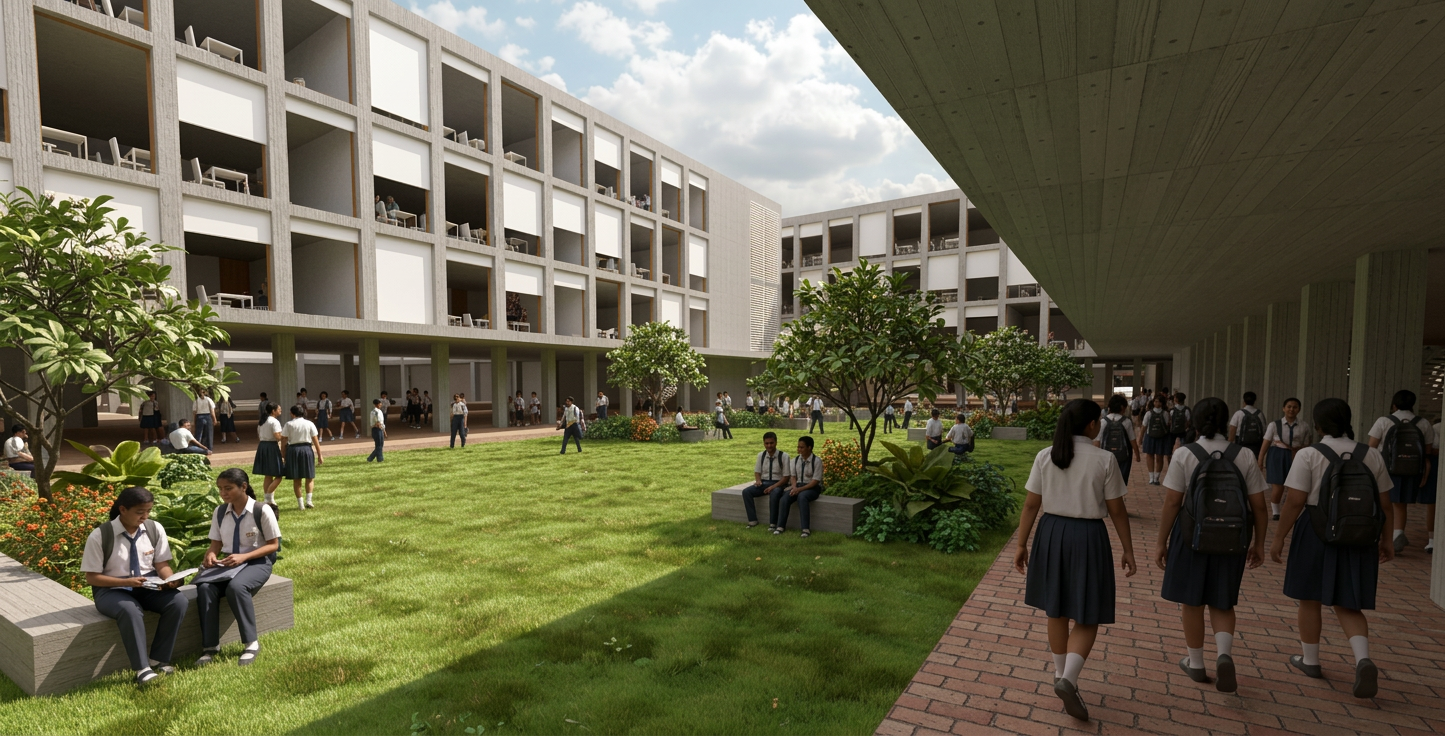 Located in the dense urban environment of Bengaluru, this school is designed as a model of climate-responsive architecture. The campus is organized around a series of courtyards that create sheltered microclimates, providing shaded social spaces for students while promoting natural ventilation throughout the buildings. The program is distributed across three distinct towers for different age groups, all unified by a consistent architectural language.