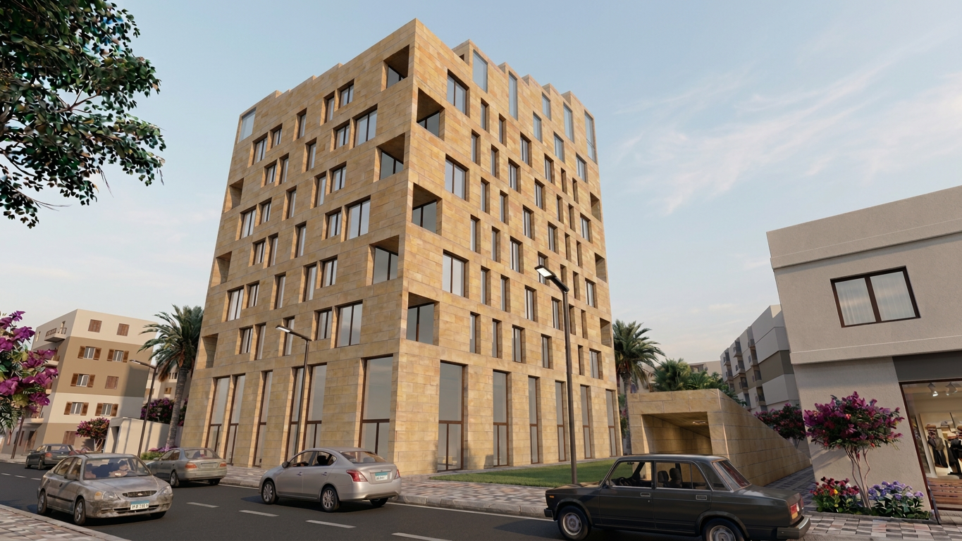 Environmental research prioritized passive climate-control strategies suitable for Egypt's hot, arid environment. The layout of exactly four corner apartments per floor ensures that every unit benefits from natural cross-ventilation, significantly reducing the reliance on mechanical cooling. Furthermore, the thick limestone cladding provides excellent thermal mass, absorbing heat during the day and releasing it at night to regulate interior temperatures. The deeply recessed, shifting window openings act as self-shading mechanisms, minimizing direct solar heat gain while still allowing diffuse natural daylight to penetrate deep into the living spaces.