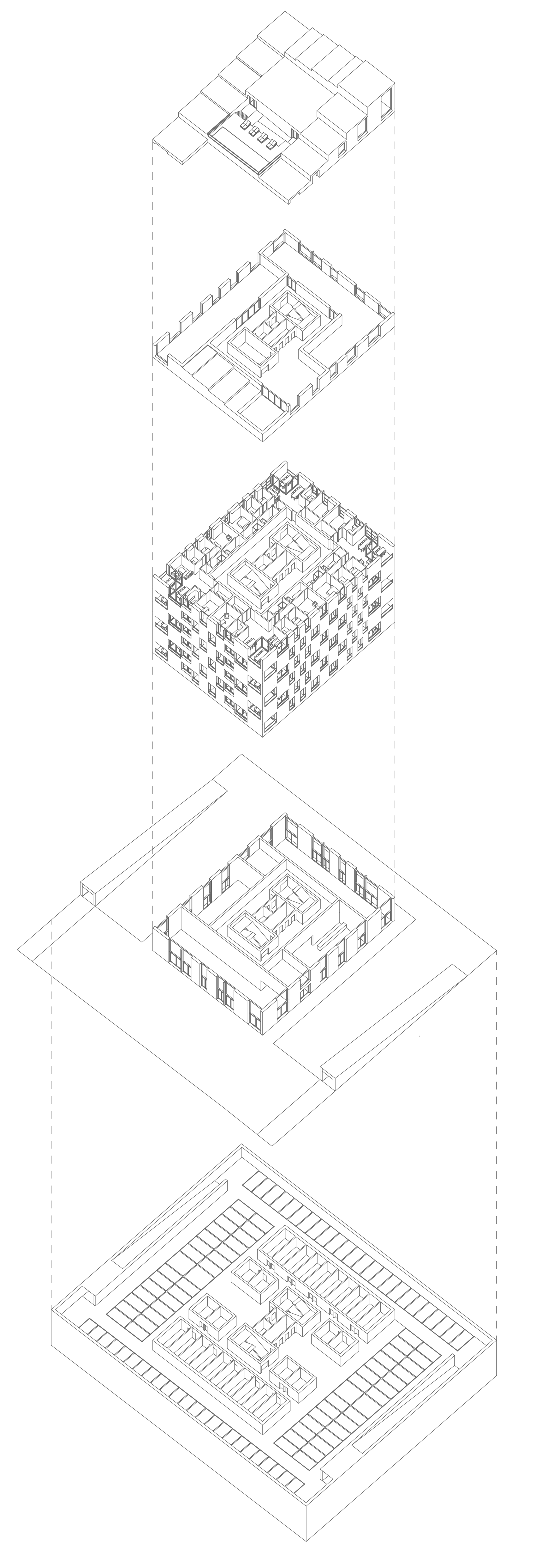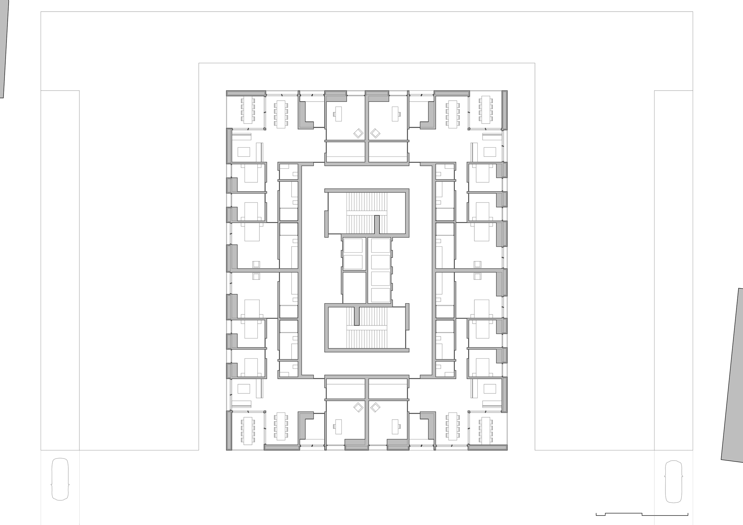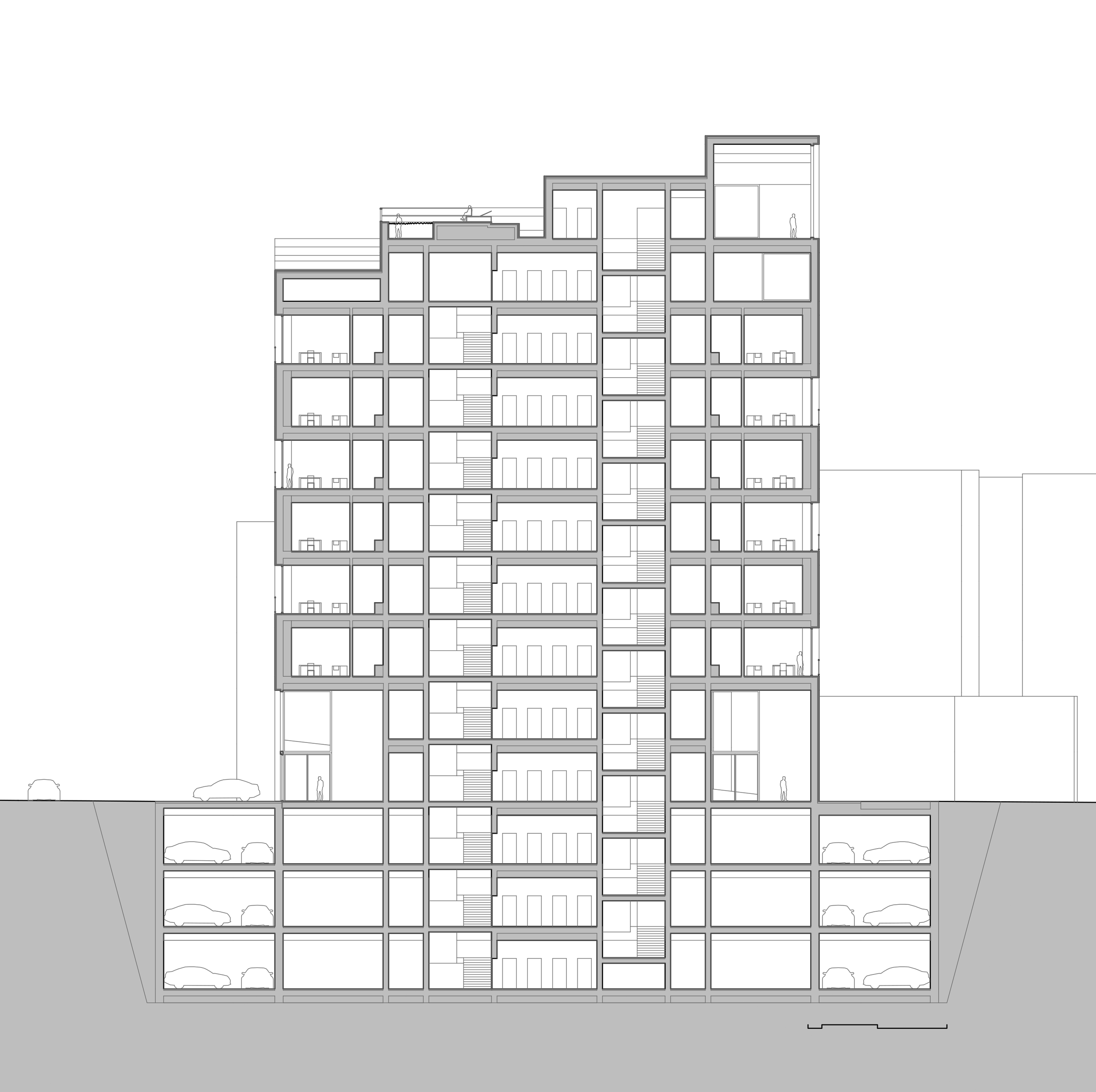 Engineering studies centered on resolving the structural complexities of the subtractive massing at the crown and the integration of the dual-core circulation system. The cascading, stepped terraces on the upper levels—which house heavy loads such as the swimming pool and public gathering spaces—required a robust structural framework that transfers loads efficiently down to the foundation without compromising the open, cross-shaped residential floor plates below. Additionally, the double-height ground floor commercial spaces necessitated careful structural detailing to maintain the heavy, monolithic appearance of the stone facade while still allowing for expansive, column-free retail areas at the street level.
