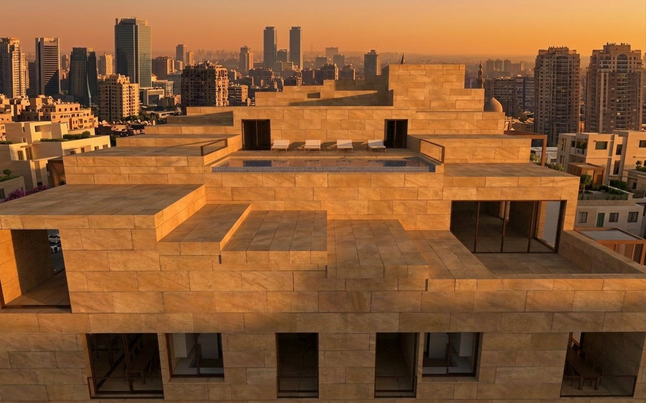 The defining gesture of the tower is its sculpted, asymmetrical crown. As the building rises, the massing begins to step back dramatically, resembling the giant, weathered blocks of a pyramid. This subtractive geometry creates a series of cascading, multi-level terraces that house a luxurious rooftop pool area and public amenities, including a restaurant and cafe. This elevated social hub provides both residents and guests with an unparalleled vantage point to take in the awe-inspiring sunsets over the Giza plateau.