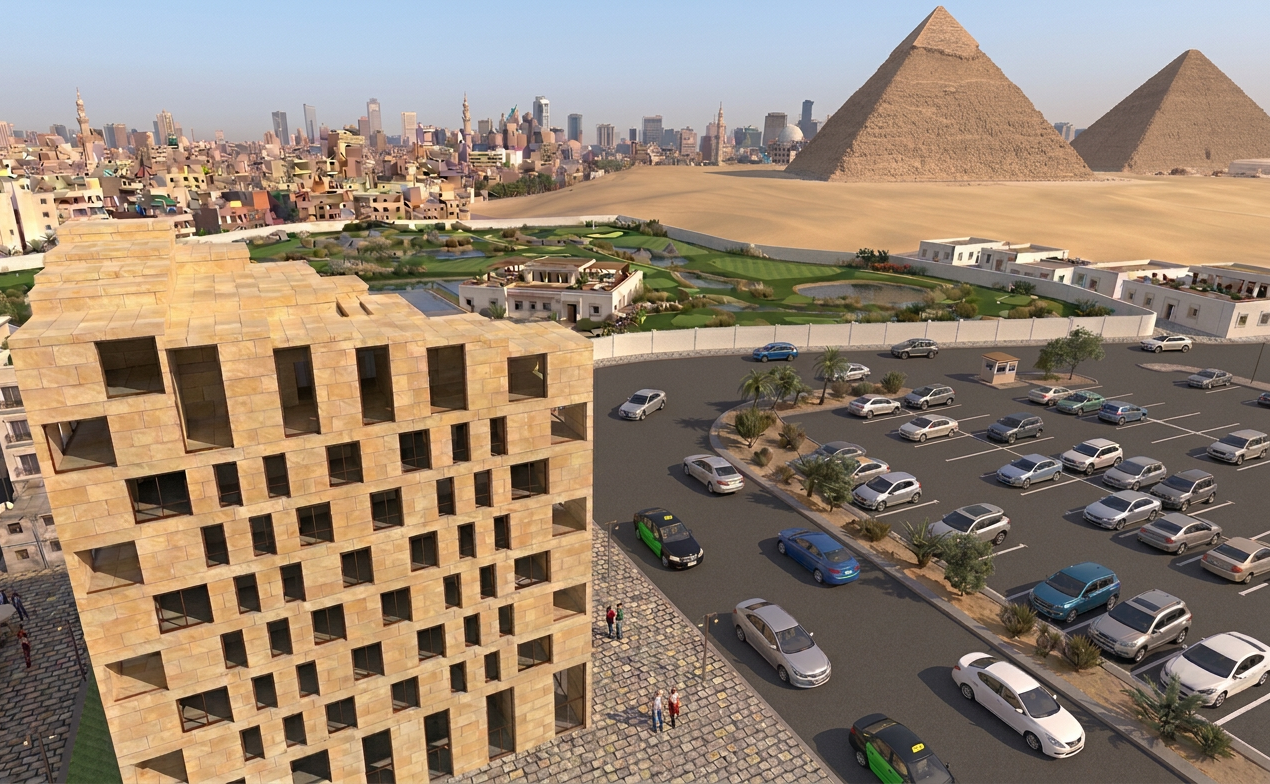 The aesthetic research focused on creating a contemporary dialogue with the monumental context of the Giza Plateau without resorting to literal pastiche. By treating the building mass as a monolithic block that is progressively "eroded" at the top, the design directly evokes the stepped, weathered geometry of the ancient pyramids. Furthermore, studies on facade articulation led to the deliberate shifting of window placements; this strategy breaks the predictable, repetitive grids typical of modern high-rises, giving the building an organic, almost geological presence that respects the timeless, monumental horizon it occupies.