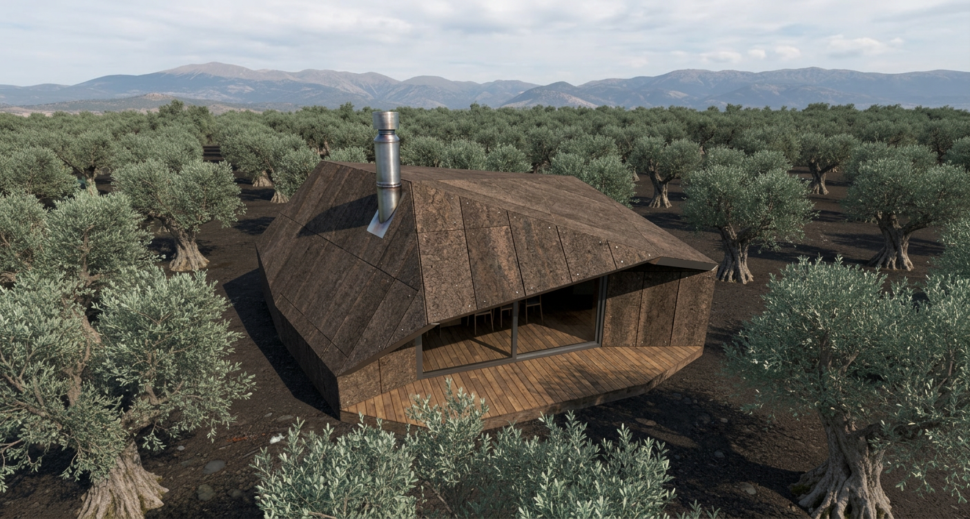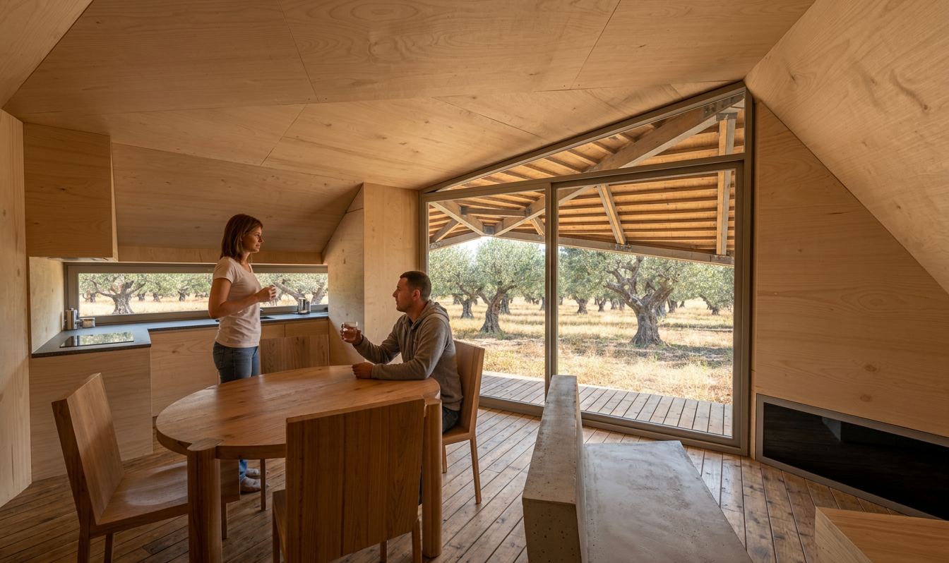 The architectural style is a direct response to the surrounding landscape, embodying principles of biophilic and site-specific design. Its faceted geometry mimics the nearby granite boulders, creating a structure that feels born of the terrain rather than imposed upon it. This approach reflects a deep respect for the genius loci, or "spirit of place." The aesthetic is one of minimalist elegance, characterized by clean lines, a limited material palette, and a focus on natural light and views. The dark, textured cork exterior provides a visual anchor in the silvery-green olive grove, while the warm, light-filled wood interior creates a sense of sanctuary.