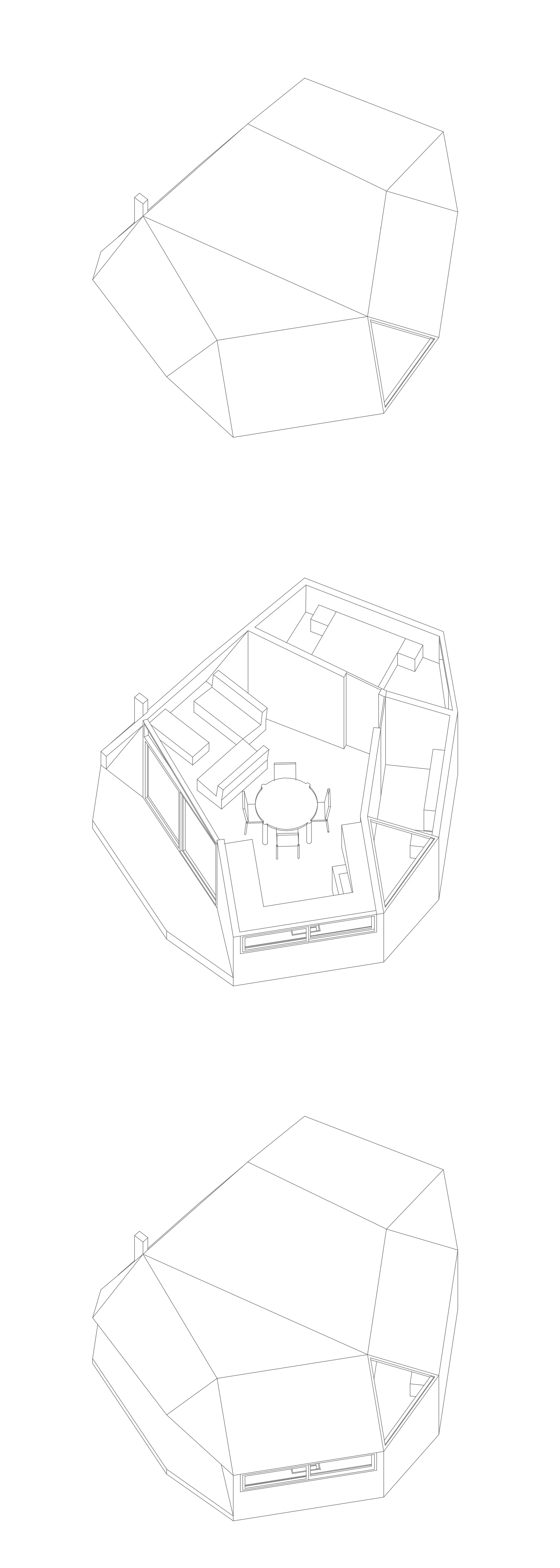 This project is a temporary refuge on a Greek island, set within a landscape of ancient olive groves and granite boulders. The design responds directly to the site's geology, adopting the faceted geometry of the surrounding rock formations. Conceived as a light-footprint Airbnb, the structure offers a minimalist retreat that integrates into the landscape rather than imposing upon it, creating a respectful dialogue between architecture and terrain.