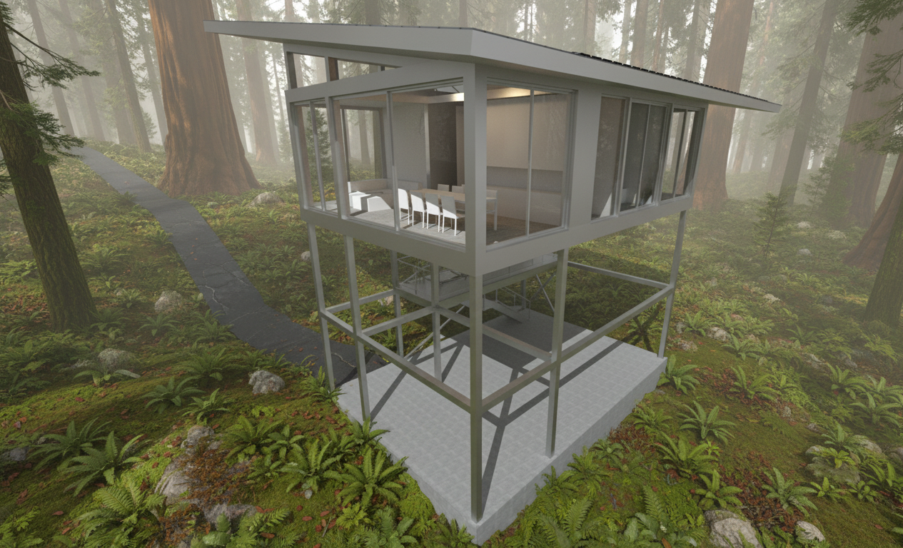 The core aesthetic direction is rooted in architectural phenomenology, which prioritizes the sensory and experiential qualities of a space over pure formalism. Research will explore how materials and light can create a "poetic dwelling" in the Heideggerian sense, fostering a deep connection between the inhabitant and the environment. Key precedents are contemporary buildings that use reflective or metallic skins not to mimic, but to enter a dialogue with their natural surroundings by capturing and diffusing ambient light. This approach turns the building into a dynamic canvas that reflects the changing conditions of the forest. The design's vertical ascent and minimalist interior are intended to dissolve the boundary between inside and out, a strategy seen in other modern homes designed for immersion in nature.