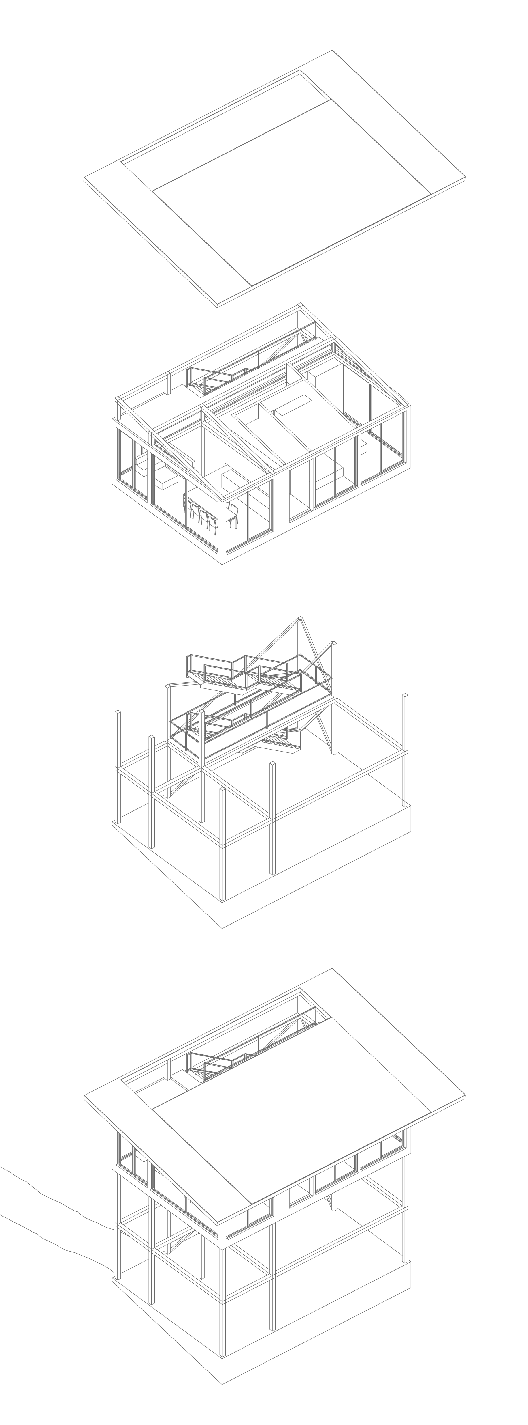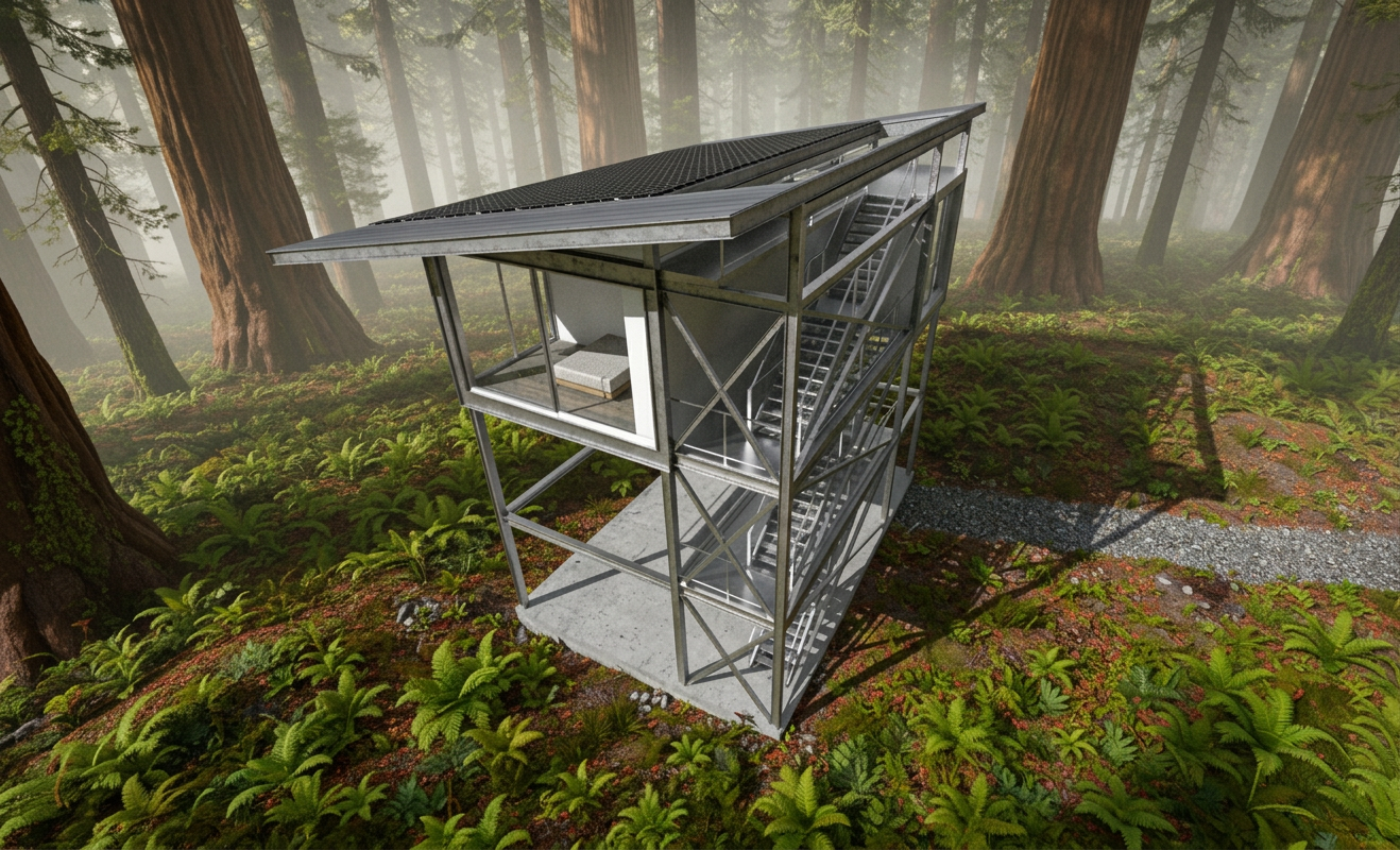 An external staircase winds up through the steel structure, transforming the act of moving between floors into a conscious journey. This path takes the inhabitant from the dark forest floor, through the mid-level trunks, and up to the canopy.