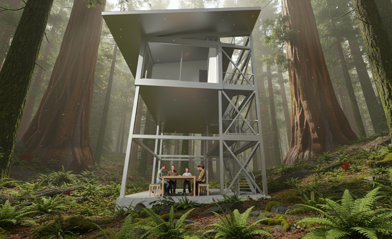This project proposes a home in Muir Woods for a tech founder seeking a tangible connection to the natural world as an antidote to their digital life. The design is not a rustic cabin, but a precise, contemporary object designed to amplify the sensory experience of the ancient redwood forest.