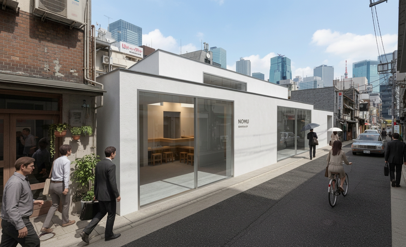 Located on a narrow street in Tokyo, NOMU Degustation Bar presents a minimalist white façade that contrasts with the visually dense urban surroundings. This stark exterior is designed to signal a transition from the chaotic city to a calm interior space.