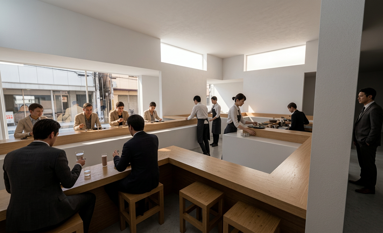 Material Aspects: The material palette is intentionally limited to enhance the minimalist and serene atmosphere. The primary materials are warm wood for the counters and furniture, and plain white walls. Wood is a traditional and staple material in Japanese architecture, valued for its ability to create a warm and natural ambiance and its connection to nature. The use of natural materials is a core principle of Japanese interior design, aiming to bring the outdoors in and create a sense of balance. In modern Japanese design, there is also a focus on sustainable building materials, with an increasing use of engineered wood and reclaimed timber to minimize environmental impact. The selection of a simple palette of wood and white is a deliberate choice to create a tranquil environment that minimizes distractions and focuses the senses on the culinary experience.