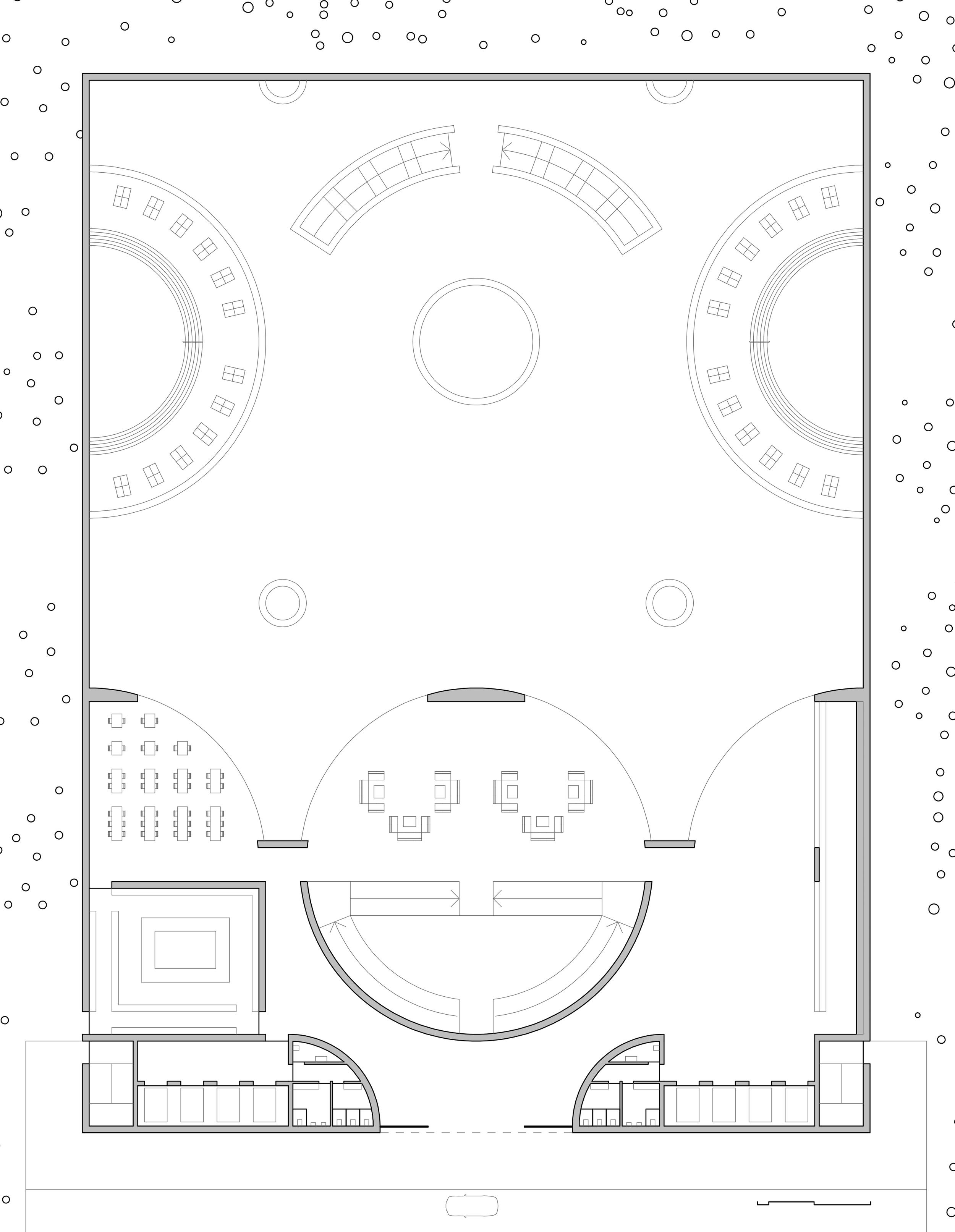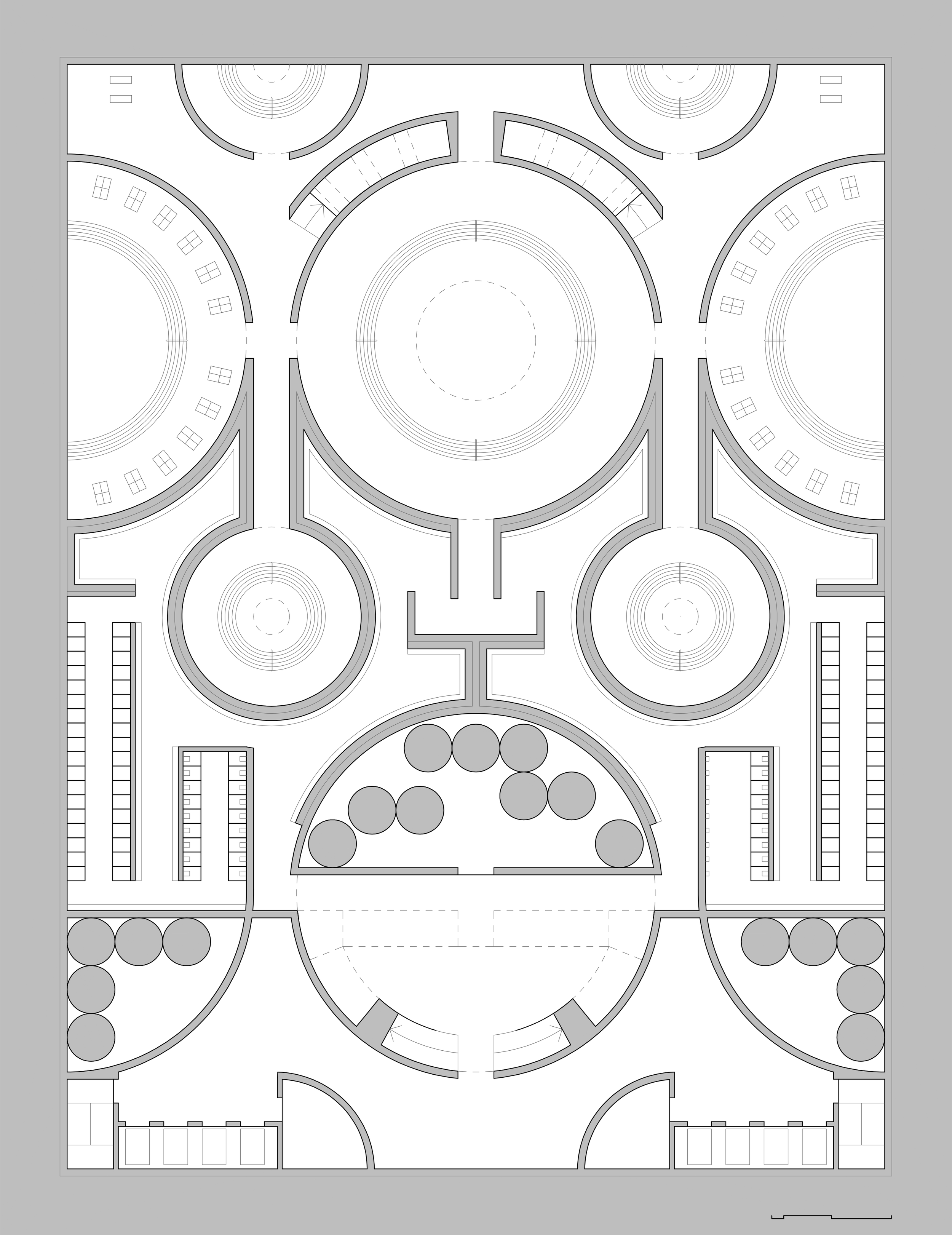 Transitioning from the bright, active garden into the bathhouse is designed as a ceremonial sequence of events—a purposeful voyage into the earth. As visitors descend into the subterranean level, they are guided by a highly structured, symmetrical floor plan. This layout seamlessly divides patrons into gender-specific changing rooms, allowing for a private, quiet transition away from the outside world. Emerging from these locker areas onto the "wet side," visitors leave their daily lives behind, stepping out into a timeless, cavernous landscape.