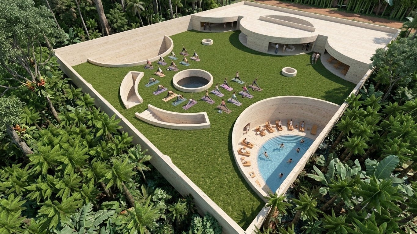 The architectural journey begins above ground, where a minimalist limestone structure serves as a calming threshold to the complex. This upper level houses the welcoming amenities, including a ticket office, a serene waiting room, and a café/restaurant. The heart of the above-ground program, however, is an expansive, walled garden punctuated by sweeping, geometric cutouts that look down into the lower levels. This verdant roof-scape acts as an active wellness hub, providing a tranquil, open-air setting for yoga, pilates, and meditation classes.