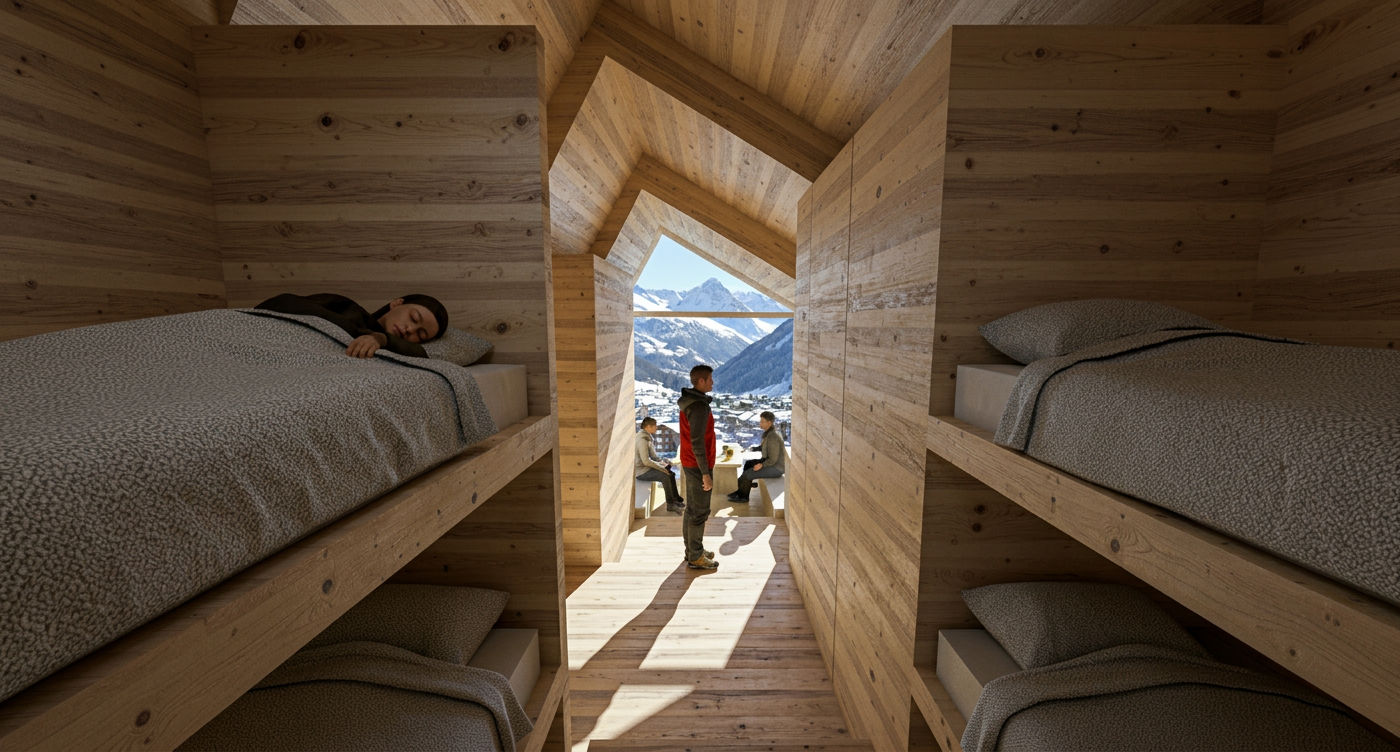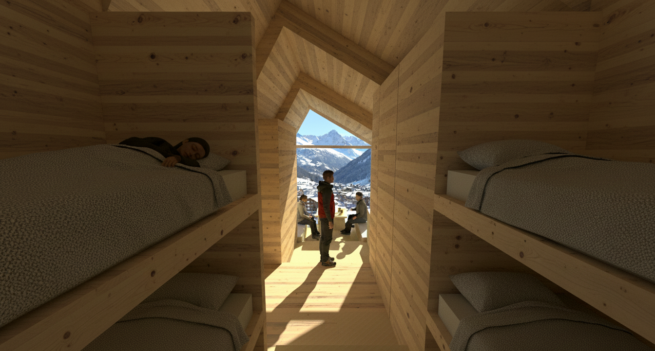 The interior is organized along a linear axis to maximize spatial efficiency. Reflecting the spartan ethos of mountaineering, the amenities are minimalist yet functional, including built-in bunk beds, a compact kitchen and bathroom, and a communal social area. The warmth of the exposed timber structure creates an inviting atmosphere, while large, strategically placed windows frame commanding views of the Matterhorn and the valley. This constant visual connection to the landscape is a central element of the inhabitant's experience. The design prioritizes durability, function, and the essential needs of its users in a remote mountain setting.